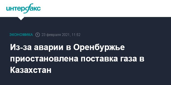Москва. 23 февраля. INTERFAX.RU - Транзит газа через ГИС "Алексеевка" в Казахстан прекращен после падения давления газа в магистральном газопроводе Оренбург-Новопсков утром 23 февраля, говорится в сообщении Минэнерго РФ.