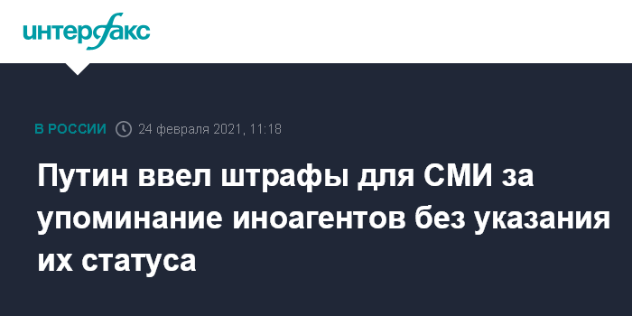 Москва. 24 февраля. INTERFAX.RU - Президент Владимир Путин подписал закон, который вводит штрафы за распространение информации об иностранных агентах и созданных ими материалах без указания их статуса. Под действие закона попадают в том числе иноагенты-физлица и не образующие юрлицо общественные организации, признанные иноагентами.