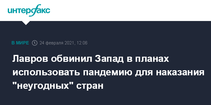 Москва. 24 февраля. INTERFAX.RU - Пандемия коронавируса и спад в мировой экономике, к которому она привела, требуют консолидации усилий, однако ряд западных стран игнорирует этот факт, продолжая использовать нелегитимные методы шантажа и давления, заявил в среду глава МИД РФ Сергей Лавров; российский министр полагает, что Запад пытается использовать пандемию для наказания "неугодных правительств".