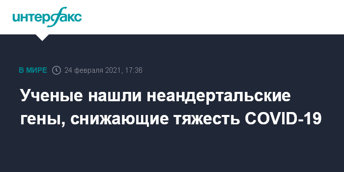 Москва. 24 февраля. INTERFAX.RU - Исследователи из Каролинского института (Швеция) и Института эволюционной антропологии общества Макса Планка (ФРГ) выявили в геноме современных людей гены, унаследованные от неандертальцев, которые облегчают течение COVID-19, сообщает издание Сибирского отделения РАН "Наука из первых рук".