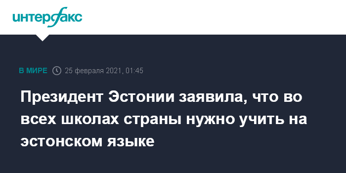 Москва. 25 февраля. INTERFAX.RU - Президент Эстонии Керсти Кальюлайд (Kersti Kaljulaid) заявила, что "соотечественники с другими культурными корнями" должны получать знания в школах с эстонским языком обучения.