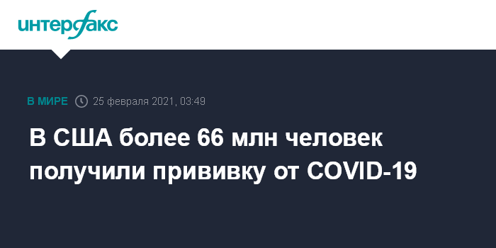 Москва. 25 февраля. INTERFAX.RU - В США прививки от коронавируса, включающие введение двух доз вакцины, сделаны 20 млн 607 тыс. 261 человеку, сообщили Центры по контролю и профилактике заболеваний США (CDC).