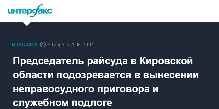 Москва. 20 апреля. ИНТЕРФАКС - Глава Следственного комитета при прокуратуре (СКП) РФ Александр Бастрыкин возбудил уголовное дело в отношении председателя Подосиновского районного суда Кировской области, подозреваемой в "вынесении заведомо неправосудного приговора" и "служебном подлоге".