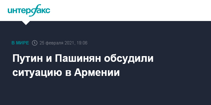 Москва. 25 февраля. INTERFAX.RU - Президент РФ Владимир Путин и премьер Армении Никол Пашинян в телефонном разговоре обсудили ситуацию в республике.