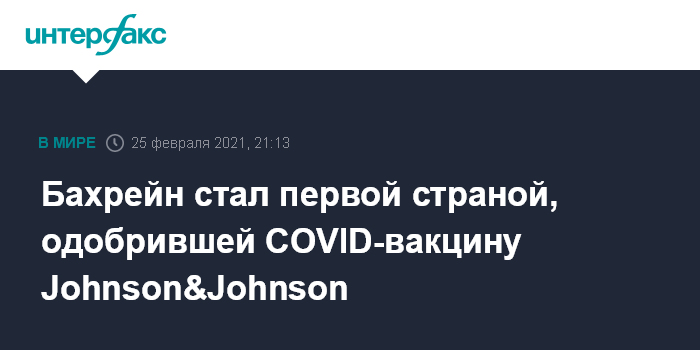 Москва. 25 февраля. INTERFAX.RU - Власти Бахрейна в четверг первыми в мире разрешили применять в экстренном порядке однодозовую вакцину компании Johnson&Johnson от коронавируса COVID-19, сообщает агентство Associated Press (AP).
