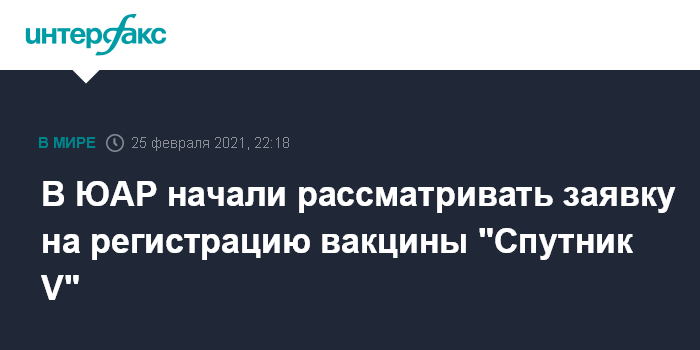 Москва. 25 февраля. INTERFAX.RU - Южноафриканский регулятор по лекарственным средствам (SAHPRA) начинает процесс изучения заявки на регистрацию в ЮАР российской вакцины "Спутник V" против коронавируса COVID-19, говорится в обнародованном в четверг пресс-релизе ведомства.