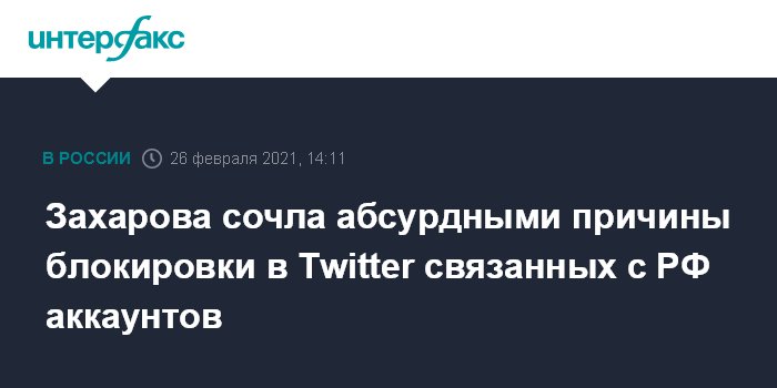 Москва. 26 февраля. INTERFAX.RU - Официальный представитель МИД РФ Мария Захарова выразила недоумение удалением ряда связанных с РФ твиттер-аккаунтов, в частности, под предлогом подрыва доверия к НАТО, и назвала это абсурдом.