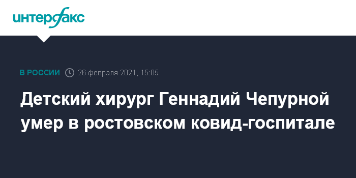Москва. 26 февраля. INTERFAX.RU - Детский хирург, заслуженный деятель науки РФ Геннадий Чепурной скончался в возрасте 81 года в ковид-госпитале в Ростове-на-Дону, сообщили "Интерфаксу" в управлении информационной политики правительства Ростовской области.