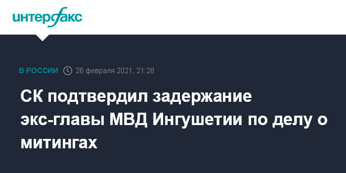 Москва. 26 февраля. INTERFAX.RU - Следственный комитет РФ подтвердил задержание в Назрани бывшего главы МВД Ингушетии, обвиняемого по делу об организации применения насилия в отношении представителей власти.