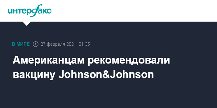 Москва. 27 февраля. INTERFAX.RU - Консультативный комитет FDA по вакцинам и соответствующим биологическим продуктам рекомендовал экстренное применение однодозовой вакцины компании Johnson&Johnson от COVID-19, сообщают американские СМИ.