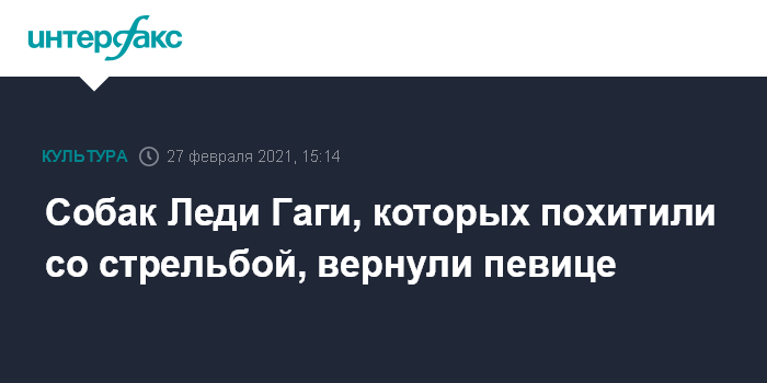 Москва. 27 февраля. INTERFAX.RU - Два бульдога американской певицы Леди Гаги были найдены живыми и здоровыми, сообщает "Би-би-си". Собак похитили в среду, 24 февраля, злоумышленники выстрелили в ассистента певицы, который выгуливал животных, и забрали собак.