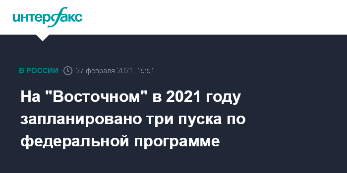 Москва. 27 февраля. INTERFAX.RU - В 2021 году на космодроме "Восточный" планируется провести три пуска по федеральной космической программе, сообщил глава "Роскосмоса" Дмитрий Рогозин.