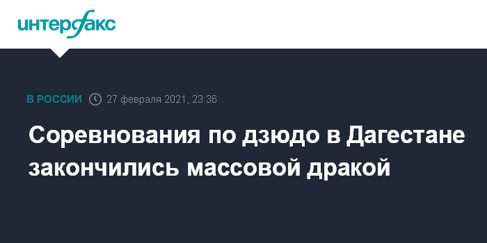 Москва. 27 февраля. INTERFAX.RU - Массовая драка с участием спортсменов и зрителей произошла во время соревнований по дзюдо в дагестанском Каспийске, сообщили "Интерфаксу" в пресс-службе МВД республики.
