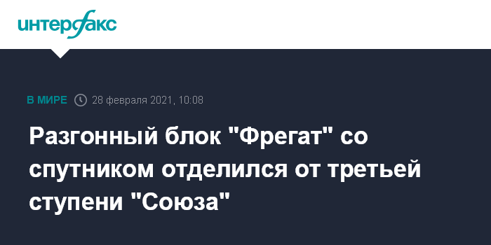 Москва. 28 февраля. INTERFAX.RU - Разгонный блок "Фрегат" успешно отделился от третьей ступени ракеты-носителя "Союз-2.1б" с космическим аппаратом "Арктика-М", ранее стартовавшей с космодрома Байконур.