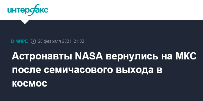 Москва. 28 февраля. INTERFAX.RU - Американские астронавты Кейт Рубинс и Виктор Гловер в воскресенье успешно завершили многочасовой выход в открытый космос с борта Международной космической станции (МКС) после проведения монтажных работ на ее поверхности, сообщило NASA.