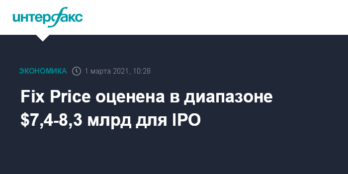 Москва. 1 марта. INTERFAX.RU - Розничная сеть Fix Price установила диапазон цены размещения в рамках IPO на уровне $8,75-9,75 за GDR, что соответствует капитализации в $7,4-8,3 млрд, сообщила компания.