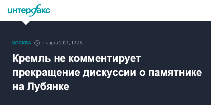 Москва. 1 марта. INTERFAX.RU - В Кремле не комментировали ход дискуссии по установке памятника на Лубянской площади Москвы, не намерены высказываться и о ее прекращении, сказал журналистам пресс-секретарь президента РФ Дмитрий Песков.