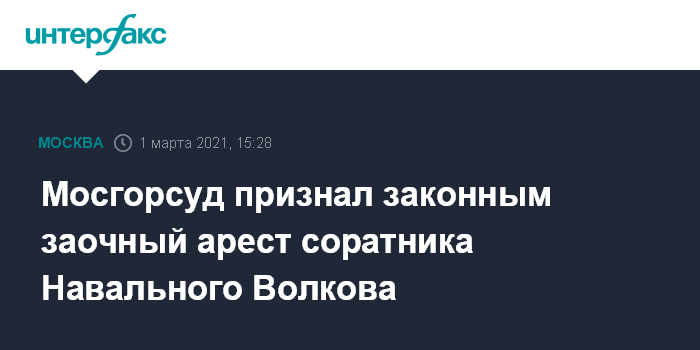 Москва. 1 марта. INTERFAX.RU - Мосгорсуд признал законным решение о заочном аресте Леонида Волкова - соратника и руководителя сети региональных штабов оппозиционера Алексея Навального.