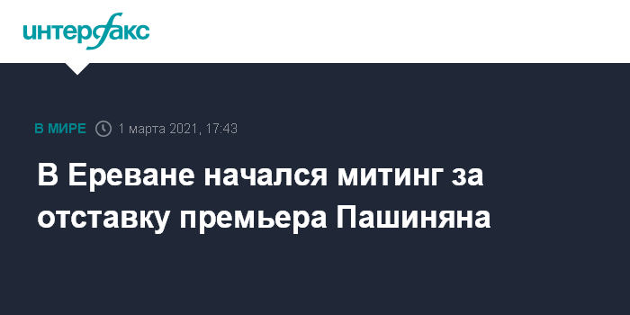 Москва. 1 марта. INTERFAX.RU - В центре Еревана на проспекте Баграмяна начался митинг оппозиции с требованием отставки премьера Армении Никола Пашиняна и возглавляемого им правительства.
