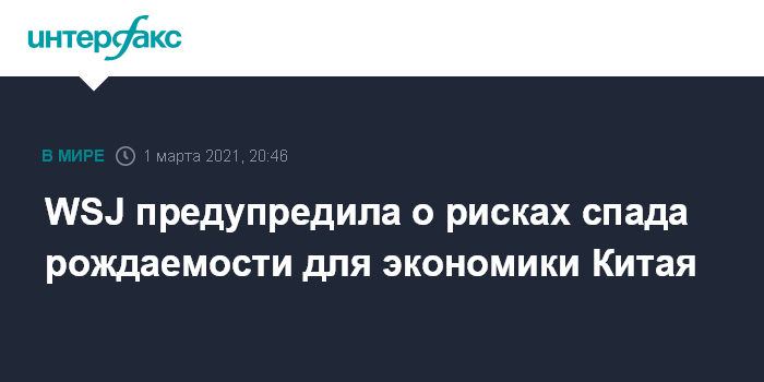 Согласно консенсус-прогнозу демографов и экономистов, опрошенных WSJ, рождаемость в Китае в 2020 году упала на 15% по сравнению с предыдущим годом, когда в стране было зафиксировано 14,65 млн новорожденных. Наиболее сдержанные оценки предполагают падение на 10%.