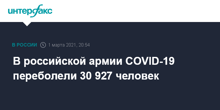 Москва. 1 марта. INTERFAX.RU - В российских Вооруженных силах коронвирусной инфекцией переболели 30 927 человек, в том числе 4400 представителей гражданского персонала, сообщили в Минобороны.