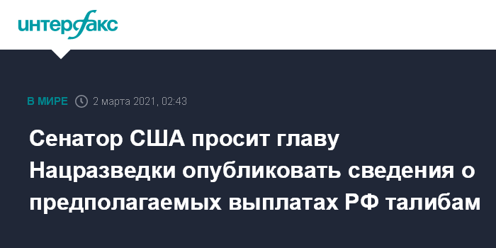 Сенатор США просит главу Нацразведки опубликовать сведения о предполагаемых выплатах РФ талибам