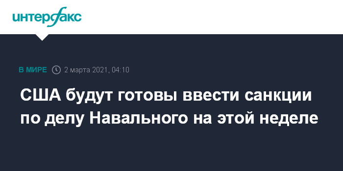 Москва. 2 марта. INTERFAX.RU - Соединенные Штаты могут ввести санкции против России в связи с ситуацией вокруг российского оппозиционера Алексея Навального на этой неделе, сообщил телеканал CNN со ссылкой на чиновников администрации.
