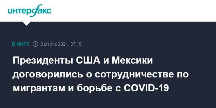 Москва. 2 марта. INTERFAX.RU - Президенты США Джо Байден и Мексики Андрес Мануэль Лопес Обрадор в ходе виртуальной встречи договорились сотрудничать в области миграции и продвижения совместных усилий по содействию взаимному и региональному развитию, говорится в совместной декларации сторон по итогам переговоров.