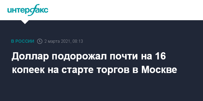 Первые сделки по доллару США прошли в диапазоне 74,28-74,35 рубля за доллар. По итогам второй минуты торгов доллар подорожал на 15,75 копейки к уровню закрытия понедельника и торговался у 74,3225 рубля. Евро подорожал на 7,5 копейки, до 89,39 рубля. Бивалютная корзина ($0,55 и 0,45 евро) подорожала на 12 копеек к уровню закрытия понедельника, до 81,1 рубля.