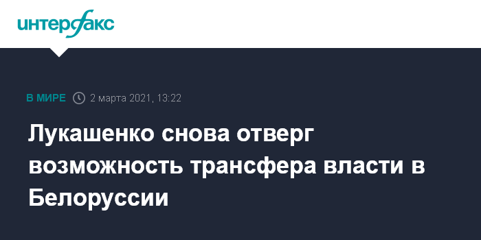 Москва. 2 марта. INTERFAX.RU - Президент Белоруссии Александр Лукашенко в очередной раз заявил, что в стране не может быть трансфера власти. Его цитирует "БелТА".