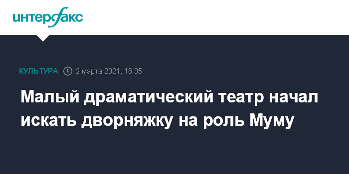 Москва. 2 марта. INTERFAX.RU - Малый драматический театр (Театр Европы) в Санкт-Петербурге ищет дворняжку на роль Муму, поскольку прежняя исполнительница этой роли заболела. Объявление опубликовано в группе театра в социальной сети "ВКонтакте"