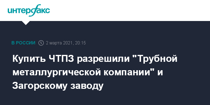 Москва. 2 марта. INTERFAX.RU - Федеральная антимонопольная служба (ФАС) РФ одобрила ходатайства на покупку "Челябинского трубопрокатного завода" как "Трубной металлургической компании", так и "Загорскому трубному заводу", сообщили "Интерфаксу" источники в отрасли.