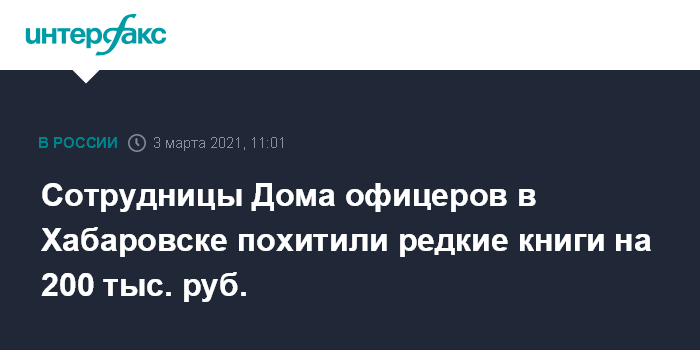 Москва. 3 марта. INTERFAX.RU - Двое бывших сотрудниц Дома офицеров Восточного военного округа в Хабаровске осуждены за хищение старинных книг, стоимость которых составляет около 200 тысяч рублей, сообщается на сайте СКР.