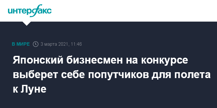 Москва. 3 марта. INTERFAX.RU - Японский бизнесмен Юсаку Маэдзава объявил о конкурсе, по итогам которого он отберет восемь человек для совместного полета вокруг Луны в 2023 году.