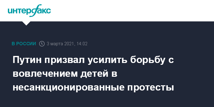 Москва. 3 марта. INTERFAX.RU - Президент Владимир Путин призвал МВД вместе с другими силовыми ведомствами активнее искать в интернете тех, кто зовет детей на несогласованные митинги, такие призывы нарушают закон, сказал он на итоговой коллегии МВД.