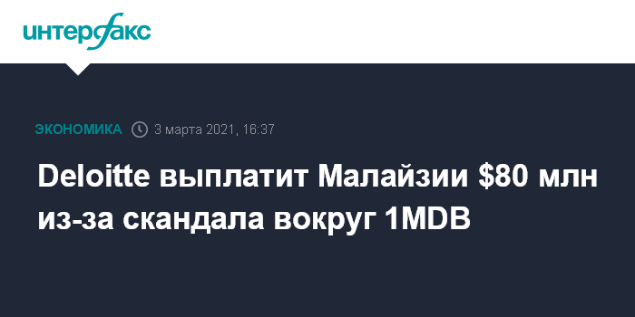 Москва. 3 марта. INTERFAX.RU - Британский аудитор Deloitte согласился выплатить правительству Малайзии 324 млн ринггитов ($80 млн) для урегулирования претензий в связи с аудитом отчетов малазийского инвестиционного фонда 1MDB и его бывшего подразделения SRC International в 2011-2014 годах, сообщает Bloomberg.