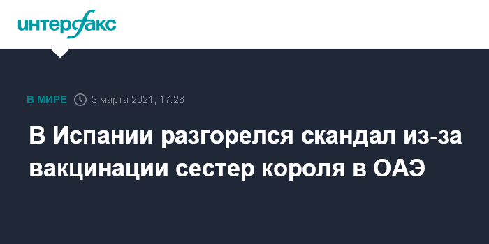 Москва. 3 марта. INTERFAX.RU - Сообщения СМИ о том, что сестры короля Испании – принцесса Елена и Кристина – сделали прививки от коронавируса в ОАЭ, вызвали резонанс в обществе, сообщает El Diario.
