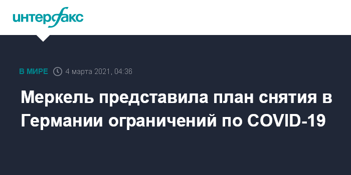 Москва. 4 марта. INTERFAX.RU - Канцлер Германии Ангела Меркель и руководители 16 федеральных земель страны разработали план поэтапной отмены ограничений, введенных в связи с пандемией коронавируса.