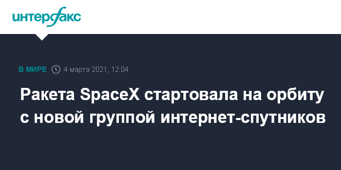 Москва. 4 марта. INTERFAX.RU - Тяжелая ракета-носитель Falcon 9 в четверг стартовала на орбиту с очередной партией из 60 мини-спутников для пополнения орбитальной группировки глобальной сети интернет-покрытия системы Starlink, сообщила компания-разработчик SpaceX.
