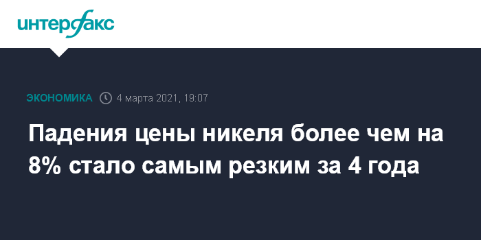 Москва. 4 марта. INTERFAX.RU - Цена никеля упала более чем на 8% в ходе торгов в четверг, до $15,945 тыс. за тонну, на фоне ослабления опасений относительно дефицита металла.