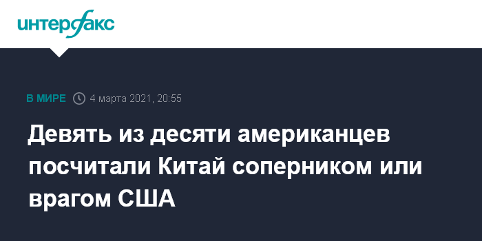 Москва. 4 марта. INTERFAX.RU - Почти 90% американцев поддерживают жесткую позицию по отношению к Пекину и не видят в КНР партнера США. Об этом свидетельствуют данные опроса исследовательского центра Пью.