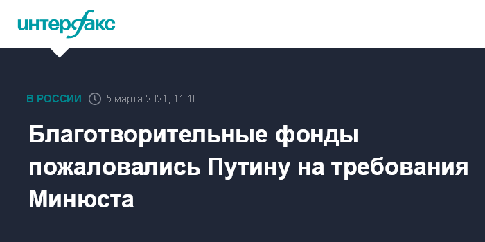 Москва. 5 марта. INTERFAX.RU - Российские благотворительные организации пожаловались президенту Владимиру Путину на вступившие в силу требования Минюста. Они обязывают раз в год предоставлять отчетность о пожертвованиях от российских юридических лиц, получающих, в свою очередь, деньги из иностранных источников. Об этом пишет "Коммерсантъ".
