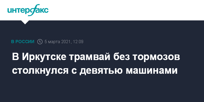 Москва. 5 марта. INTERFAX.RU - В Иркутске рядом с железнодорожным вокзалом трамвай с отказавшими тормозами утром в пятницу столкнулся с девятью машинами. Пострадали два человека, сообщили в пресс-службе областного управления МВД.