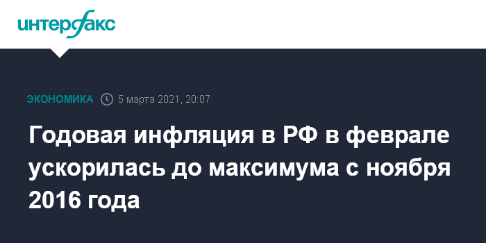 Это максимальное значение годовой инфляции с ноября 2016 года (тогда она равнялась 5,8%) и выше ожиданий ЦБ - председатель Банка России Эльвира Набиуллина на пресс-конференции 12 февраля заявляла, что годовая инфляция в России достигнет пика в районе 5,5% в начале марта, после чего начнет постепенно снижаться.