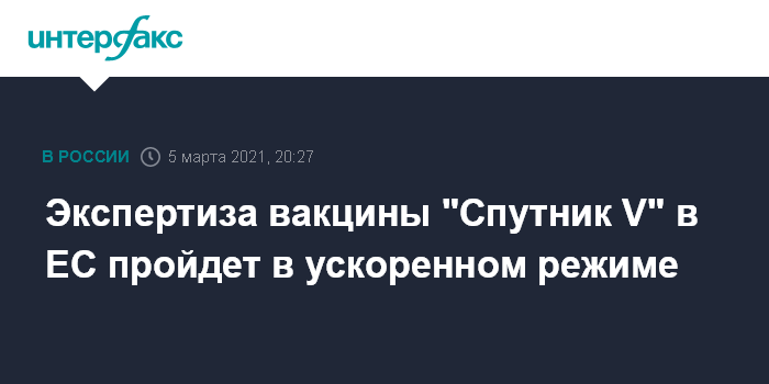 Москва. 5 марта. INTERFAX.RU - Процедура постепенной экспертизы российской вакцины от коронавируса "Спутник V" в ЕС будет идти в ускоренном режиме. Об этом говорится в мартовском отчете германского Института Пауля Эрлиха.