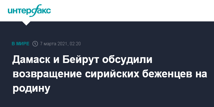 Москва. 7 марта. INTERFAX.RU - Министр иностранных дел Сирии Фейсал Микдад и ливанский министр по общественным делам Рамзи Машрифия обсудили в Дамаске проблему возвращения сирийских беженцев на родину, передают сирийские официальные СМИ.