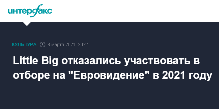 Москва. 8 марта. INTERFAX.RU - Группа Little Big, которая должна была представлять Россию на конкурсе "Евровидение" в 2020 году, не будет участвовать в отборе 2021 года. Год назад песенный смотр был отменен из-за пандемии коронавируса.