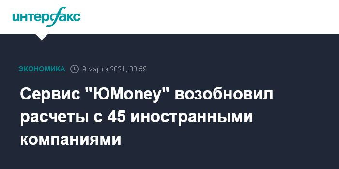 Москва. 9 марта. INTERFAX.RU - Принадлежащий Сбербанку платежный сервис "ЮMoney" (бывшие "Яндекс.Деньги") сообщил, что возобновил прерванные в январе операции с 45 компаниями-нерезидентами и продолжает консультации с Банком России по поводу отмены ограничений на расчеты с другими иностранными юрлицами.