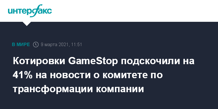 Москва. 9 марта. INTERFAX.RU - Акции американской корпорации GameStop в понедельник подорожали на 41,2% после того, как совет директоров владельца сети магазинов видеоигр объявил о создании комитета по стратегическому планированию и распределению капитала.