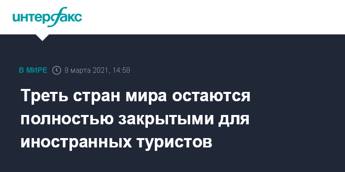Москва. 9 марта. INTERFAX.RU - Треть стран мира остаются полностью закрытыми для иностранных туристов, особенно строгие ограничения действуют в Азиатско-Тихоокеанском регионе и Европе, следует из отчета Всемирной туристской организации ООН (UNWTO).